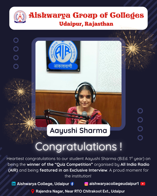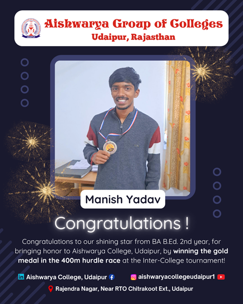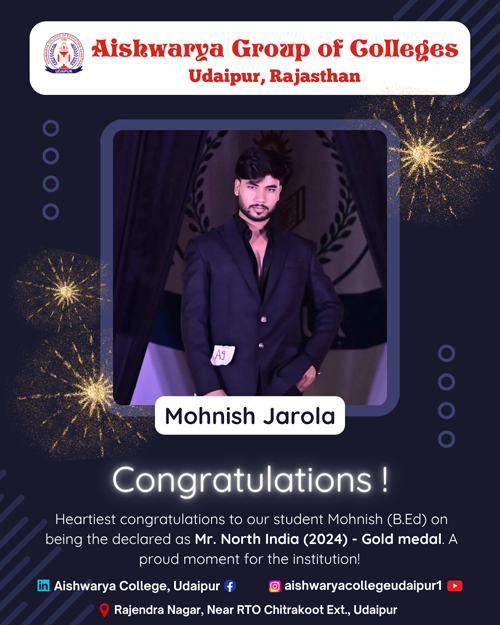 Aishwarya College proudly announces that Mohnish Jarola, a student of BA third semester, has achieved a remarkable feat by winning first place and securing the gold medal at the North India Bodybuilding Competition 2024. Competing in the 55 kg weight category, Mohnish has earned the prestigious title of Mr. North India. This achievement highlights Mohnish's dedication, discipline, and hard work in the field of bodybuilding. The entire Aishwarya family extends its heartfelt congratulations to Mohnish Jarola on this outstanding accomplishment and wishes him continued success in all his future endeavours.