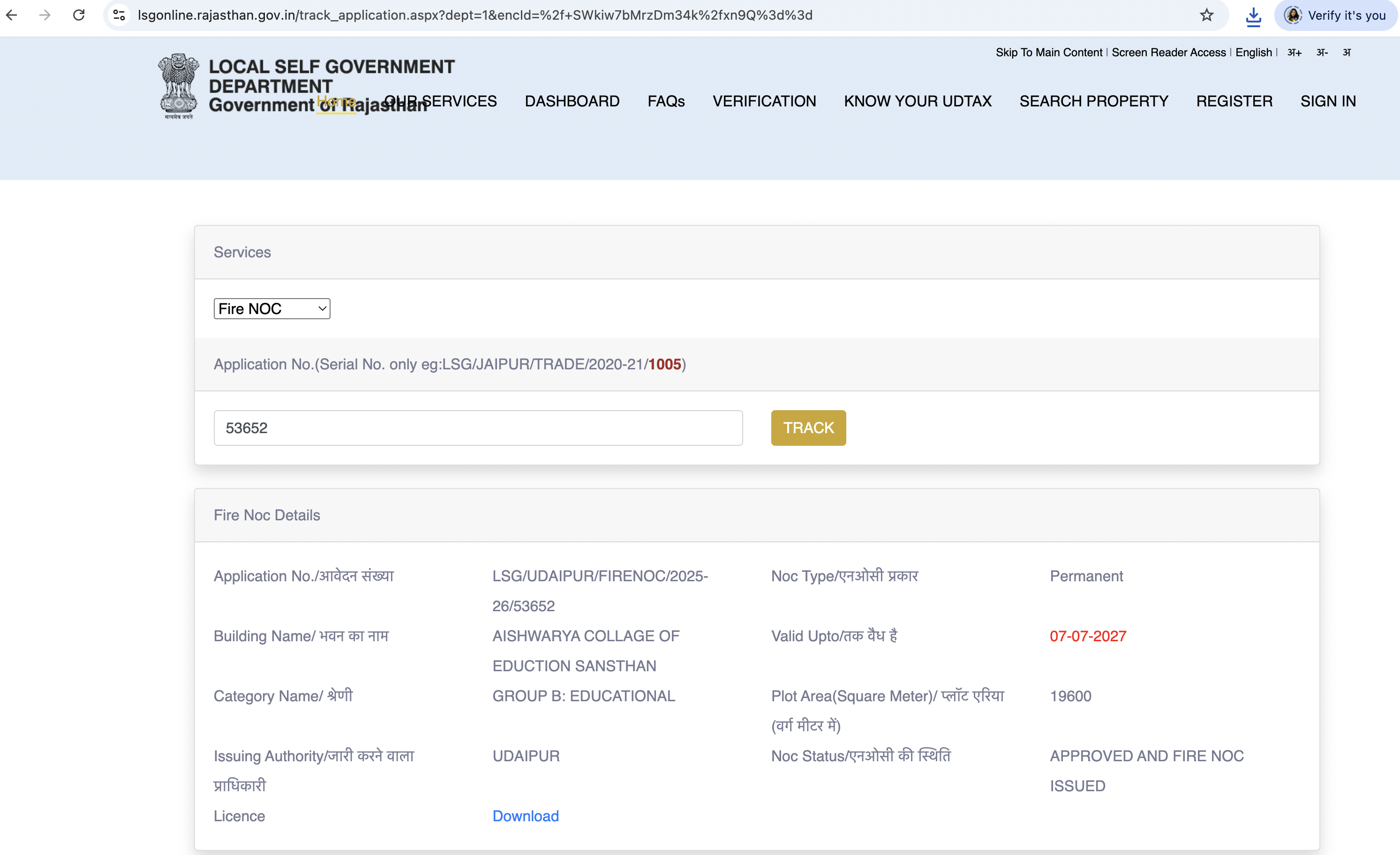 Fire Safety Certificate issued by Fire Safety Department, Government of Rajasthan verifiable on the official portal of the Fire Department, Government of Rajasthan URL: https://lsgonline.rajasthan.gov.in/track_application.aspx?dept=1&encId=/+SWkiw7bMrzDm34k/xn9Q==